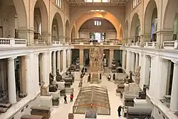 Nach der Eröffnung 1902 waren im Ägyptischen Museum ca. 50.000 Ausstellungsstücke zu sehen. Mit mehr als 150.000 Artefakten beherbergt es heute die größte Sammlung altägyptischer Kunst weltweit.[2] Die Ausstellung erstreckt sich über zwei Stockwerke mit über 100 Sälen. Im Erdgeschoss sind die Objekte nach den Epochen chronologisch geordnet, das heißt von der Prädynastik bis hin zur Griechisch-römischen Zeit sowie Funde aus nubischen Gräbern. Einen Sonderbereich innerhalb des Ausstellungsbereichs zum Neuen Reich nimmt die sogenannte Amarna-Gallery ein. Im 1. Obergeschoss befinden sich die Objekte, die ungestört oder nahezu ungestört aufgefunden wurden, also als geschlossener Fundkomplex präsentiert werden. Hier sind Fundstücke aus dem Grabschatz des Tutanchamun, Modell-Boote, Königsmumien, die Grabbeigaben von Juja und Tuja, die Mumienportraits aus dem Fayyum sowie Ostraka und Papyri ausgestellt.