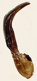 Wie in vielen Fällen unterscheiden sich die männlichen Geschlechtsteile (Aedeagus, Abb. 8) bei den äußerlich sehr ähnlichen Arten deutlich. Bei allen Arten der Gattung sitzen einem Basisteil (farblich nicht gekennzeichnet) zwei Seitenteile (Parameren) auf, die den Penis umschließen.