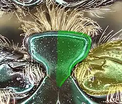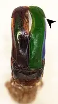 Abb. 8: Aedeagus, links in Auf- sicht und teilweise koloriert, rechts von der Seite grün: inneres Blatt blau: äußeres Blatt weiß: dorsaler Spalt Pfeilspitze: Zähnchen |