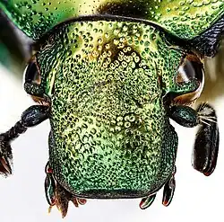Der Kopfschild ist viereckig, sein Vorderrand ist aufgebogen und ausgebuchtet. Seitlich ist er über den Fühlern ausgeschnitten, so dass deren Einlenkungsstelle von oben sichtbar ist. Die Fühler sind zehngliedrig, die letzten drei Glieder sind nach vorn lamellenartig verlängert und bilden gemeinsam eine Keule. Die Stirn ist zwischen den Augen kräftig, einfach und dichter als bei Protaetia cuprea an dieser Stelle punktiert (Abb. 2).
