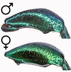 Das Pygidium ist bei den Männchen einfach gewölbt, bei den Weibchen flacher und mit zwei schrägen Eindrücken, die von hinten außen nach vorn oben verlaufen (Abb. 4).[16][17][9]
