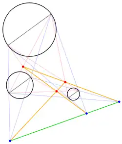 Eine Strecke MN kann wie im Bild der Durchmesser eines Kreises sein mit Mittelpunkt O mittig auf MN und Radius R=|ON|. Entsprechendes kann wie im Bild für eine zu MN parallele Strecke mn mit Kleinbuchstaben vereinbart werden. Für die Berechnung des äußeren Ähnlichkeitspunkts A und des inneren I der Strecken oder der Kreise können die Punkte in der xy-Ebene als Vektoren (x,y) oder als komplexe Zahlen (x+i·y) mit imaginärer Einheit i2=−1 benutzt werden. Dann gilt: