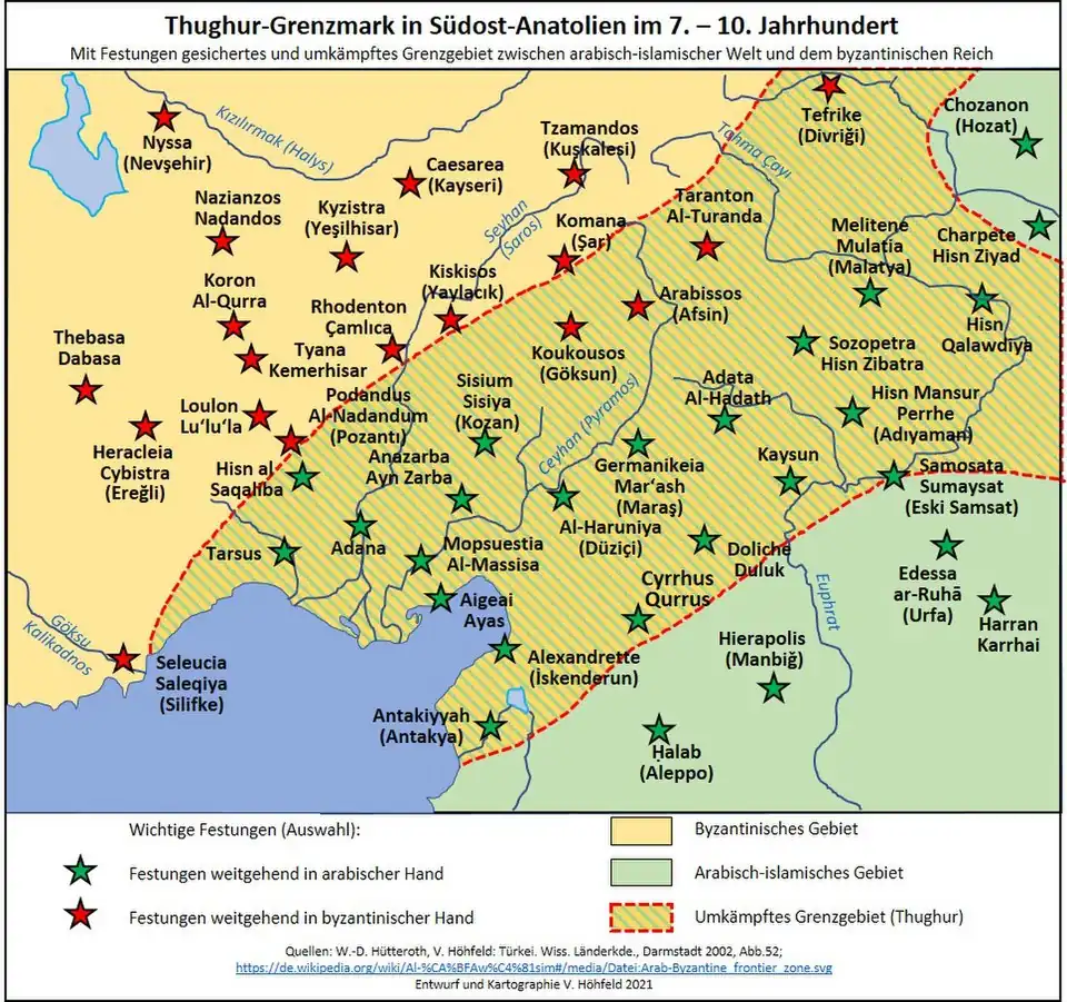 Als die Byzantiner unter dem oströmischen Kaiser Heraklios (610-641) Syrien und damit auch die Çukurova den Arabern überließen, hatten sie alle Städte zerstört und die Stadtbewohner getötet oder verbannt. Auch die Araber plünderten und verheerten damals Städte auf ihren Raubzügen, begannen aber seit 800 n. Chr., die Städte an der Grenze zu Byzanz zu befestigen. So entstand die „Thughur-Linie“ (al-T̲h̲ug̲h̲ūr / T̲h̲ug̲h̲ūr al-Rūmīya), ein Gebiet von arabischen Festungen gegen die Byzantiner in den syrischen und mesopotamischen Grenzmarken, u. a. auch in der Çukurova als Grenze und Ausgangsbasis für weitere arabische Angriffe auf das oströmische Territorium. Der Osten (Çukurova) war mit dem arabischen Emirat von Tarsus verbunden. Trotz byzantinischer Rückeroberungsversuche dauerte die arabische Herrschaft in Kilikien bis zur erneuten byzantinischen Besetzung im Jahr 965, als mit der Regierungszeit des oströmischen Kaisers Konstantin VII. Ostrom begann, die verlorenen Orte wiederzugewinnen. Im Zuge dieser byzantinischen Reconquista, die die arabisch-muslimische Bevölkerung vollständig ausrottete oder vertrieb, kam es zu einem massiven Rückgang der kilikischen Bevölkerung, die bereits während der arabischen Zeit zurückgegangen war. Die damals entstandene Bevölkerungslücke wurde mit Menschen verschiedener Herkunft aufgefüllt,[40] unter anderem mit Armeniern.