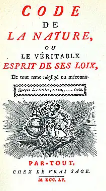 Der Code de la Nature kann als frühsozialistisches Werk bezeichnet werden, in dem Privatbesitz als der Urgrund allen Übels beschrieben wird. So heißt es zum Beispiel in Artikel 1 des dort festgehaltenen Strafgesetzes: „Wer […] auch nur den Versuch macht, […] das verabscheuungswürdige Privateigentum wieder einzuschmuggeln, wird […] als ein Feind der Menschheit angesehen. […] Sein Name wird für immer aus den Listen der Bürger gestrichen.“[2]