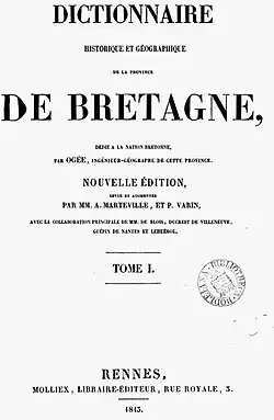 - ↑ a b c Jean-Baptiste Ogée, A. Marteville & P. Varin (1843: neue, überarbeitete Edition). Dictionnaire historique et géographique de la provence de Bretagne, dédié à la nation bretonne (Band 1). Rennes: Molliex.