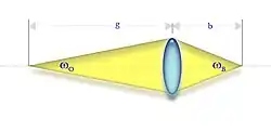 Dagegen fallen bei einer Sammellinse Eintritts- und Austrittspupille in der Linsenmitte zusammen – der Durchmesser der Pupillen entspricht jeweils demjenigen der Linse. Somit entspricht der Abstand des Objektpunktes zur Eintrittspupille der Gegenstandsweite , und der Abstand des Bildpunktes zur Austrittspupille entspricht der Bildweite .
