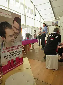 Primäres Wirkungsfeld der HuK waren ab den 1970er Jahren die Evangelischen Kirchentage. Auch die Teilnahme daran war anfangs schwierig, von Bedenken der Veranstalter und Hindernissen beim Zugang zu den Veranstaltungen geprägt.[12] Es kam auch zu Angriffen durch Evangelikale.[13] Beim Kirchentag in Nürnberg 1979 organisierte die HuK eine Podiumsdiskussion zum Thema „Homosexualität und Evangelium“ mit. Helmut Kentler, langjähriges HuK-Mitglied, saß auf dem Podium. Die HuK setzte sich auf diesem Kirchentag mit einer Resolution für Pfarrer Klaus Brinker ein[Anm. 3], dem die Landeskirche Hannover ein Gemeindepfarramt verweigert hatte. Die Resolution erhielt mit 4.709 unterstützenden Unterschriften[14] eine so große Zahl[Anm. 4], dass sie zu einer offiziellen Erklärung des Kirchentags wurde.[15]