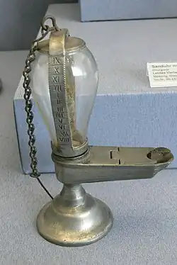 Die Öllampenuhr[1] auch Öluhr oder Zeitlampe genannt, ist eine gläserne Öllampe, die mit Markierungen versehen ist. Am Stand des verbliebenen Öls kann man die vergangene Zeit ablesen.[2] Öluhren gehören zu den Elementaruhren.[3]