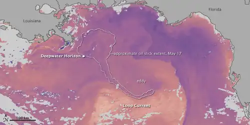 Der Vorsitzende Ozeanograph der „Ocean Observing and Monitoring Group“ der North Carolina State University, Ruoying He, gab am 5. Mai 2010 bekannt, dass der Süden von Florida sowie die Florida Keys dann betroffen wären, wenn sich der Ölteppich bis zum Golfstrom ausbreitet. Nach Ruoying He hängt in diesem Fall die Betroffenheit der Küsten weiter nördlich wesentlich von den örtlichen Windbedingungen ab, da sich der Golfstrom südöstlich von Charleston, im Süden von South Carolina, von der Küste entfernt. Dies wird durch den „Charleston Bump“, eine bis zu 400 m hohe Erhebung über dem Meeresboden, verursacht. Der Direktor des „Institute of Marine Sciences“ der University of Northern Colorado, Rich Luettich, wies darauf hin, dass das Öl auch für ein Jahr oder länger als lokales Problem verbleiben könnte und noch im Herbst oder kommenden Frühling Maßnahmen zum Küstenschutz erfordern könnte.[44] Am 19. Mai 2010 veröffentlichte die ESA Bilder des Envisat-Satelliten, die befürchten lassen, dass das Öl den Loop Current (Schleifenstrom) erreicht hat.[45][46] Mitte Juni 2010 bestätigen MODIS-Daten der NASA-Satelliten Terra und Aqua eine weitere Ausbreitung des Ölteppichs.[47][48][49] Das Jet Propulsion Laboratory sammelte weitere Daten mit Synthetic Aperture Radar.[50] Anfang Juli erreichten Teerklumpen auch die Küste von Texas. Damit waren zwei Monate nach dem Unglück die Küsten aller US-amerikanischen Bundesstaaten am Golf von der Ölpest betroffen.[51]