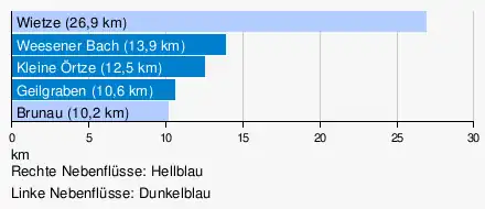 | Rechte Nebenflüsse | Ilster, Hollmoorgraben, Wietze, Brunau, Habach, Pannenbach, Brandenbach, Hasselbach, Faule Rieth, Diester Graben, Neuer Bach, Mühlenbach, Rollbach, Örtzekanal | |