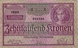 Weiter bestehende enorme Budgetdefizite in Deutschösterreich (unter anderem zur Subventionierung der Lebensmittel) und Währungsspekulationen trieben die Inflation weiter an, die mit eigenen Mitteln nicht zu stoppen war. Der Wert der Papierkrone gegenüber der Goldkrone fiel bis August 1922 auf 14.400 : 1.[7] Bundeskanzler Ignaz Seipel benötigte 1922 ausländische Hilfe und einen international überwachten strikten Sparkurs, damit die Staatsfinanzen wieder ins Lot gebracht werden konnten. Als dies gelang, bereitete die Bundesregierung Seipel I 1924 die Einführung der Schillingwährung vor. Diese Währungsreform wurde vom Nationalrat am 20. Dezember 1924, einen Monat nach dem Rücktritt Seipels, beschlossen und mit 1. März 1925 realisiert (In der folgenden mehrmonatigen Übergangszeit wurden österreichische Kronen noch akzeptiert). Der Wert eines Schillings entsprach 10.000 „Papierkronen“.