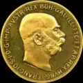 100 Kronen „C CORONÆ“, Adler mit Wappen, Wert, Jahr der Prägung „FRANC•IOS•I•D•G•IMP•AVSTR•REX BOH•GAL•ILL•ETC•ET AP•REX HVNG•“, Franz Joseph I. ohne Lorbeerkranz, unter Bildnis mit „ST•SCHWARTZ“ 1909–1914