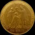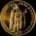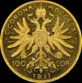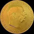 100 Korona[18] „MAGYAR KIRÁLYSÁG“, 2 Engel mit Wappen, Wert, Münzzeichen „K•B“ „FERENCZ JÓZSEF I•K•A•CS•ÉS M•H•S•D•O•AP•KIR•“, stehender Franz Joseph I., Jahr der Prägung (Neuprägung mit Jahr 1908 erkennbar an der eher rötlichen Farbe und den nicht mattierten erhabenen Münzteilen)[17][19] 1907–1908
