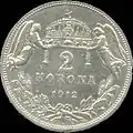 „VIRIBVS VNITIS“ „II CORONÆ“, Adler mit Wappen, Wert, Jahr der Prägung „FRANC•IOS•I•D•G•IMP•AVSTR•REX BOH•GAL•ILL•ETC•ET AP•REX HVNG•“, Franz Joseph I. ohne Lorbeerkranz, unter Bildnis mit „ST•SCHWARTZ“ 1912–1913