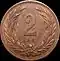 geriffelt Wert, Münzzeichen „K•B“ (Neuprägungen mit Punkt unter K•B)[14] „MAGYAR KIRÁLYI VÁLTÓPÉNZ“, Stephanskrone, Jahr der Prägung 1892–1894, 1906–1908, 1914