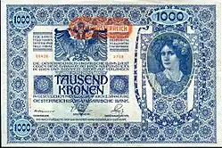 Banknote zu 1000 Kronen, 1902; der Aufdruck „Deutschösterreich“ wurde ab März 1919 angebracht – Vorderseite