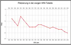 | 29 WM-Spiele 12 Siege 4 Unentschieden 13 Niederlagen 43:47 Tore | |