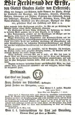Anfang September beschloss der konstituierende österreichische Reichstag die Bauernbefreiung von der Erbuntertänigkeit. Dies war eine der wenigen dauerhaften Errungenschaften der Revolution. Die Dankbarkeit der Bauern dokumentiert zum Beispiel das neue Lied vom allverehrten Kaiser Ferdinand (1848).