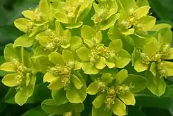 Die Blütezeit reicht von Mai bis Juli. Die Einzelblüten sind zu – für die Arten der Gattung Wolfsmilch typischen – Cyathien angeordnet.[2] Diese vereinigen sich zu einem Pleiochasium, einer doldenförmigen Thyrse. Den obersten Blattachseln entspringen seitliche Teilblütenstände, die die fünfstrahlige endständige Scheindolde nicht überragen. Die Hüllblätter der Blütenstandsstrahlen sind eiförmig-rundlich und gelbgrün gefärbt. Die Hüllchenblätter der Einzelblütenstände weisen eine verkehrt-eiförmige oder eiförmige Form auf und sind ebenfalls von gelbgrüner Farbgebung. Der 4 bis 5 Millimeter lange Hüllbecher des Cyathiums wird aus fünf miteinander verwachsenen Hochblättern gebildet. An dessen Rand befinden sich vier extraflorale querovale, stumpfe Nektardrüsen, die ovale Anhänge ohne Hörnchen aufweisen. Das Cyathium enthält nur eingeschlechtliche Blüten, die zudem keine Blütenhülle besitzen. Im Zentrum befindet sich die weibliche Blüte, die aus einem oberständigen, dreifächrigen, gestielten Fruchtknoten besteht. Die drei Griffel enden in je zwei Narben. In der weiteren Entwicklung verlängert sich der Fruchtknoten und hängt daraufhin nach einer Seite über den Hüllbecher hinaus. Die männlichen Blüten sind in den Achseln der Hochblätter inseriert und bestehen aus einem einzigen gestielten Staubblatt mit zwei Staubbeuteln.