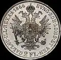 2 Gulden | „FRANC•IOS•I•D•G•AVSTRIAE IMPERATOR“, Franz Joseph I., Münzzeichen, Kranzschleifenende tief | 1866 | |||||