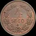 4 Kreuzer | 27 mm | 13,333 g | glatt | Wert, Jahr der Prägung, Münzzeichen | „K•K•OESTERREICHISCHE SCHEIDEMÜNZE“, großer Adler | 1860, 1861, 1864 | |