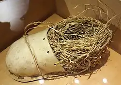 Ötzis Schuhe bestehen aus verschiedenen Materialien. Für den Schaft wurde Rindsleder[83][84] (frühere Bestimmung: Hirsch) verwendet, dessen Haarseite nach außen zeigte. Die Sohle bestand aus besser isolierendem Bärenfell, dessen Haarseite innen lag. An der Unterseite der Sohle wurde ein quer laufender und sich überkreuzender Lederstreifen angebracht, der damit die älteste bekannte Profilsohle eines Schuhs darstellt. Schaftleder und Sohle wurden von einem umlaufenden – in Vorstichtechnik eingezogenen – Lederband gehalten. Der Innenschuh bestand aus gedrillten und verzwirnten Grasschnüren. Dieses Geflecht war durch den umlaufenden Lederriemen fest mit der Sohle verbunden, nach oben zum Schaft hin aber offen.[86] Zwischen das Geflecht des Innenschuhs und das Schaftleder wurde trockenes Süßgras (Fieder-Zwenke und Borstgras) gestopft, das als Polster und Isolierschicht diente.[87][88] Der speziell für Erfordernisse im Hochgebirge gebaute Schuh wurde mit einem „Schnürsenkel“ aus Lindenbast verschlossen.