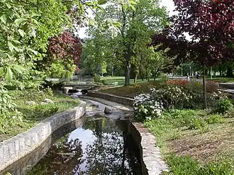 ![]() Der Úšovický potok beim Hotel Bohemia im Kurpark von Marienbad | ||