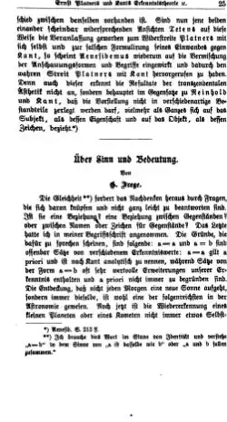 - Gottlob Frege: Über Sinn und Bedeutung. In: Zeitschrift für Philosophie und philosophische Kritik. Band 100, 1892, S. 25–50 (Digitalisat und Volltext im Deutschen Textarchiv).
