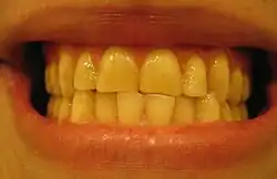 Der Begriff Überbiss beschreibt als Überbegriff das Lageverhältnis von Oberkieferfrontzähnen zu Unterkieferfrontzähnen. Man unterscheidet dabei zwischen Overjet und Overbite.[1] Es handelt sich nicht um eine Diagnose einer Fehlstellung, sondern um die Beschreibung der Lageverhältnisse. Bei optimalen Lageverhältnissen der oberen und unteren Schneidezähne spricht man von einem Scherengebiss. Erst wenn der Overjet oder der Overbite von der Norm abweichen, kann es sich um eine zu korrigierende Fehlstellung handeln.