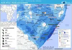 Nach starken Regenfällen im April 2022 kam es zu Überschwemmungen in KwaZulu-Natal, die zusammen mit Erdrutschereignissen mindestens 500 Menschenleben in der südafrikanischen Provinz forderten. Über 40.000 Menschen mussten ihre Häuser verlassen.[2][3] Bei den bisher schwersten Überschwemmungen im Jahr 1987 waren 506 Menschen ums Leben gekommen.[4][5]