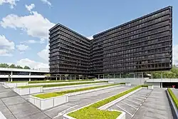 - ↑ Für die Beschreibung der Fassadengestaltung werden häufig Vergleiche zum Seagram Building gezogen.