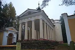 - Gusseisernes Kreuz mit vergoldeter Figur des Heiland und der Mutter Gottes, vor dem Eingang der Kirche, errichtet 1826 von Karl und Dorothea von Rey