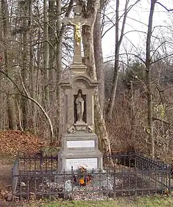 - Kreuz mit beschriftetem Sockel und Marienfigur