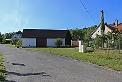 - Holzkreuz vor dem Haus Nr. 1, es wurde aus einem Baumstamm geschnitzt und ist mit einem Baldachin überdacht.