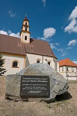 - Gedenkstein für Václav Hořejší vor der Kirche