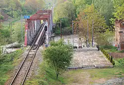 Grdelica-Brücke mit der Erinnerungsstätte für die Zivilen Opfer des NATO-Angriffs vom 13. April 1999