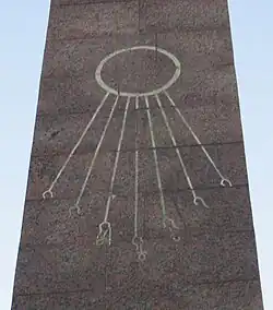 Weiter oben am Obelisken ist eine Sonnenscheibe des ägyptischen Sonnengottes Aton eingemeißelt,[13] womit – wie auch mit den Hieroglyphen – Ägypten als Auftraggeber deutlich Bezug auf sein antikes Erbe nimmt.[3] Pharao Echnaton und Nofretete verehrten Aton in ihrem Versuch die Vielgötterei durch Monotheismus zu überwinden, worin manche Gelehrte (unter anderen Sigmund Freud) eine Quelle des jüdischen Eingottglaubens sehen.[13] Zudem sind die Namen vier ägyptischer Offiziere unterschiedlicher Ränge am Obelisken verzeichnet.[13]