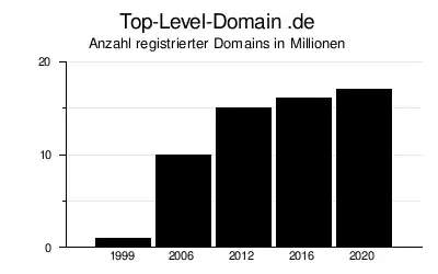 Die Marke von 15 Millionen .de-Domains wurde im April 2012 überschritten, seit Juni 2006 gibt es mehr als 10 Millionen Adressen.[6] Die erste Million wurde am 5. Oktober 1999 erreicht.