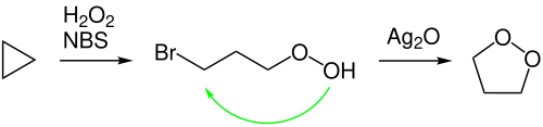 Eine 1986 vorgestellte Synthese beruht auf der radikalischen Ringöffnung von Cyclopropan mittels N-Bromsuccinimid und Wasserstoffperoxid, was zu einem β-Bromhydroperoxid führt. Dieses wird wiederum durch die Bromid-Abstraktion mit Silber(I)-oxid zum Dioxolanring geschlossen. Es entsteht jeweils stöchiometrisch Silberbromid und Silberhydroxid als Nebenprodukte.[9]