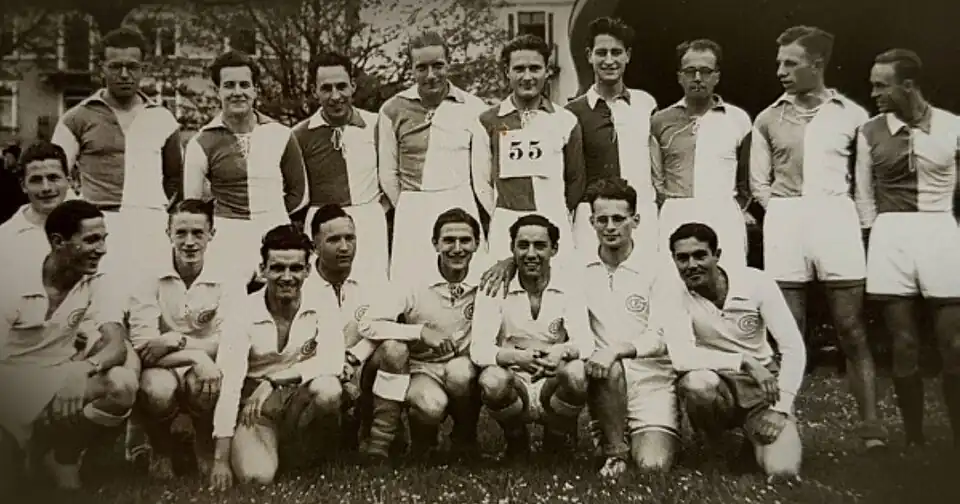 Team des Grasshopper Club Zürichs am 14. Mai 1944 Stehend v. l. n. r.: Dieter Bührle , Ernst Dubs , Ernst Erni, Hans Kaiser, Edi Höhn, ?? Fink, Werner Hürlimann, Otto Büche, Werner Elber Kniend v. l. n. r.: Otto Dürst, Otto Schwarz , Walter Hofer, Georges Weidmann, Fritz Maurer, Guido Valentini, Jack Bolli , Hans Ramming, John Wanner