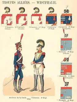 - Ab 1808 weißer Rock mit altrosa bzw. roter Abzeichenfarbe. Rosa Paspel an den Schoßtaschen. Silberne Knöpfe. Rosafarben waren auch Kragen, Ärmelaufschläge und Rabatten, jeweils mit weißer Paspel (n. Suhr). Rosa Schoßaufschläge ohne Paspel, mit weißer Granate im Winkel. Ungewiss ist, ob das Regiment um 1809 schon einen Kürass (Brustpanzer) trug. Offiziere hatten weiße, Mannschaften rote Fransenepauletten nach französischem Muster. Der Raupenhelm war aus Weißmetall mit schwarzer Pelzraupe und seehund/leoparden-brauner (n. Lienhardt) bzw. schwarzer (n. Knötel) Fellverbrämung (Turban). Helmkamm, Kinnriemen (Schuppenkette) und Schirmbeschlag waren aus Messing bzw. goldfarben. Auch befand sich am Helm ein goldfarbenes Stirnschild, das mit dem Kamm verbunden war und die Initialen „J. N“ für Jérôme Napoléon zwischen Lorbeerzweigen oder, beim 2. Kürassier-Regiment, die Regimentsnummer in einem Granatensymbol zeigte.[19] Ein roter oder weißer Federstutz wurde links am Helm eingesteckt.