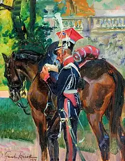 Zwischen den Franzosen und den Alliierten wurde bald darauf Frieden geschlossen. Die Polen wurden in Dresden stationiert. In der kurzen Friedenszeit konnten sie sich erholen, waren aber auch bei der Bekämpfung von Partisanen eingesetzt. Im Juni 1813 wurde eine siebte Escadron aufgestellt, was das Regiment auf eine Personalstärke von 1750 Reitern brachte.[39] Das Regiment wurde in drei Gruppen aufgeteilt: die ersten drei Escadrons gehörten zur Alten Garde, die vierte und fünfte und die sechste Escadron zur Mittleren Garde, die siebte Escadron zur Jungen Garde.