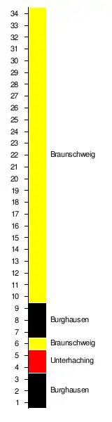 | 18. | Eintracht Braunschweig | 2:2 | 1:1 | 1:1 | 0:2 | 0:2 | 0:1 | 0:1 | 2:0 | 0:1 | 1:0 | 0:0 | 0:2 | 1:0 | 1:2 | 0:1 | 2:3 | 3:1 | |