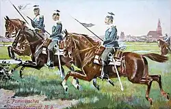 Als Ergebnis der Reorganisation des Preußischen Heeres wurde durch Allerhöchste Kabinettsorder zum 7. Mai 1860 (Stiftungstag)[1] die Aufstellung des kombinierten Ulanen-Regiments aus den 5. Eskadronen des Kürassier-Regiments Nr. 4 und Nr. 8 sowie des Ulanen-Regiments Nr. 7 und der 2. Eskadron des Ulanen-Regiments Nr. 5 bestimmt. Die Garnison befand sich zunächst in Anklam, Ueckermünde und Treptow an der Tollense. Am 4. Juli 1860 erhielt der Verband den Namen 2. Pommersches Ulanen-Regiment Nr. 9 und stand ab 1862 geschlossen in Demmin.