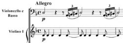 Die Exposition beginnt mit aufsteigenden Bässen zu den Synkopen der Streicher. Es lässt sich zunächst keine charakteristische Melodie erkennen, so wie es in der Klassik üblich war, sondern es entsteht durch die Synkopen und triolischen Auftakte der Streicher ein unruhiges Stimmungsbild. Stückweise kommen mit langen gehaltenen Tönen die Holzbläser dazu. In Takt 16 stimmt das Orchestertutti in die Melodie ein.