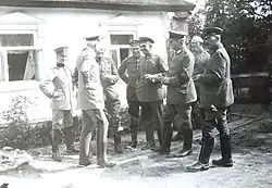 Divisionsstab in Okopy (bei Baranowitschi) Oktober 1916 v. links: Rittmeister d.R. Heckt, Adjutant, Generalleutnant von Dickhuth-Harrach, Rittmeister d.R. Hasbach, Oberlt.d.R. Hannemann Kdr. des Stabsquartiers, ? | |