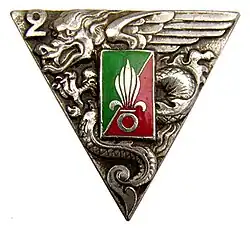 Die 2e REP gliedert sich in neun Kompanien sowie eine Reservekompanie (6e Compagnie). Die 5. Kompanie (5e Compagnie de Combat) mit der Spezialisierung Wüstenkampf wurde Ende 2015 aufgestellt[4]. Die bisherige 5e Compagnie (Instandhaltungskompanie) wurde in CMR (Compagnie de Maintenance Régimentaire) umbenannt.
