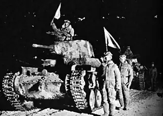 ![]() Ein Typ 97 Shinhōtō Chi-Ha Panzer der 3. Panzer-Division während einer Nachtoperation während der Operation Ichi-gō, Dezember 1944 | |