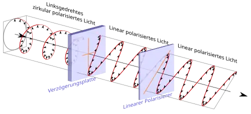 Die zirkulare Polarisation ist etwas schwieriger zu verstehen. Eine zirkulare Polarisation liegt bei einer Phasendifferenz zwischen den beiden senkrecht zueinander stehenden linear polarisierten Anteilen (in die man jede Polarisation zerlegen kann) gleicher Amplitude vor. Den räumlichen und zeitlichen Amplitudenverlauf kann man sich bildlich wie eine Schraube mit Links- bzw. Rechtsgewinde vorstellen. Sie wird in der Regel durch zwei aufeinanderfolgende Filtervorgänge aus unpolarisiertem Licht erzeugt. Zuerst wird das unpolarisierte Licht linear polarisiert und dann mit Hilfe eines Lambda/4-Verzögerungsfilters in Drehung versetzt. Die Anordnung des λ/4-Filters entscheidet darüber, ob die Drehung linksherum oder rechtsherum erfolgt. Dabei muss der λ/4-Filter genau 45° zu der linearen Polarisation ausgerichtet werden, um eine saubere zirkulare Schwingung zu erzeugen. Die zirkularen Filter sind in der Regel schon als fertig verschweißte Filter erhältlich, die dann als links- oder rechtsdrehende Zirkularfilter bezeichnet werden.