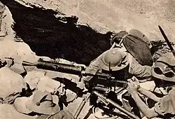 Während der von Mussolini angeordneten italienischen Frühjahrsoffensive im März 1941 befand sich die 5. Alpinidivision „Pusteria“ am äußersten linken Rand des Angriffsbereichs. Nach anfänglichen Erfolgen blieb auch hier der Angriff nach wenigen Tagen schließlich stecken.[21] Nach Beginn des Balkanfeldzuges durch die Achsenmächte am 6. April befahl der Oberbefehlshaber der italienischen Streitkräfte in Albanien, General Ugo Cavallero, der 5. Alpinidivision „Pusteria“ am 14. April in Richtung Erseka vorzurücken. Nach vier Tagen brach der letzte griechische Widerstand zusammen und am 19. wurde Erseka erreicht. Bei Inkrafttreten des Waffenstillstandes am 23. April 1941 stand die Division knapp jenseits der albanisch-griechischen Grenze bei Konitsa im Epirus.[22] Während des etwa fünfmonatigen Griechenlandfeldzuges hatte die Division über 2500 Ausfälle zu verzeichnen, davon fast 400 Tote.[23]